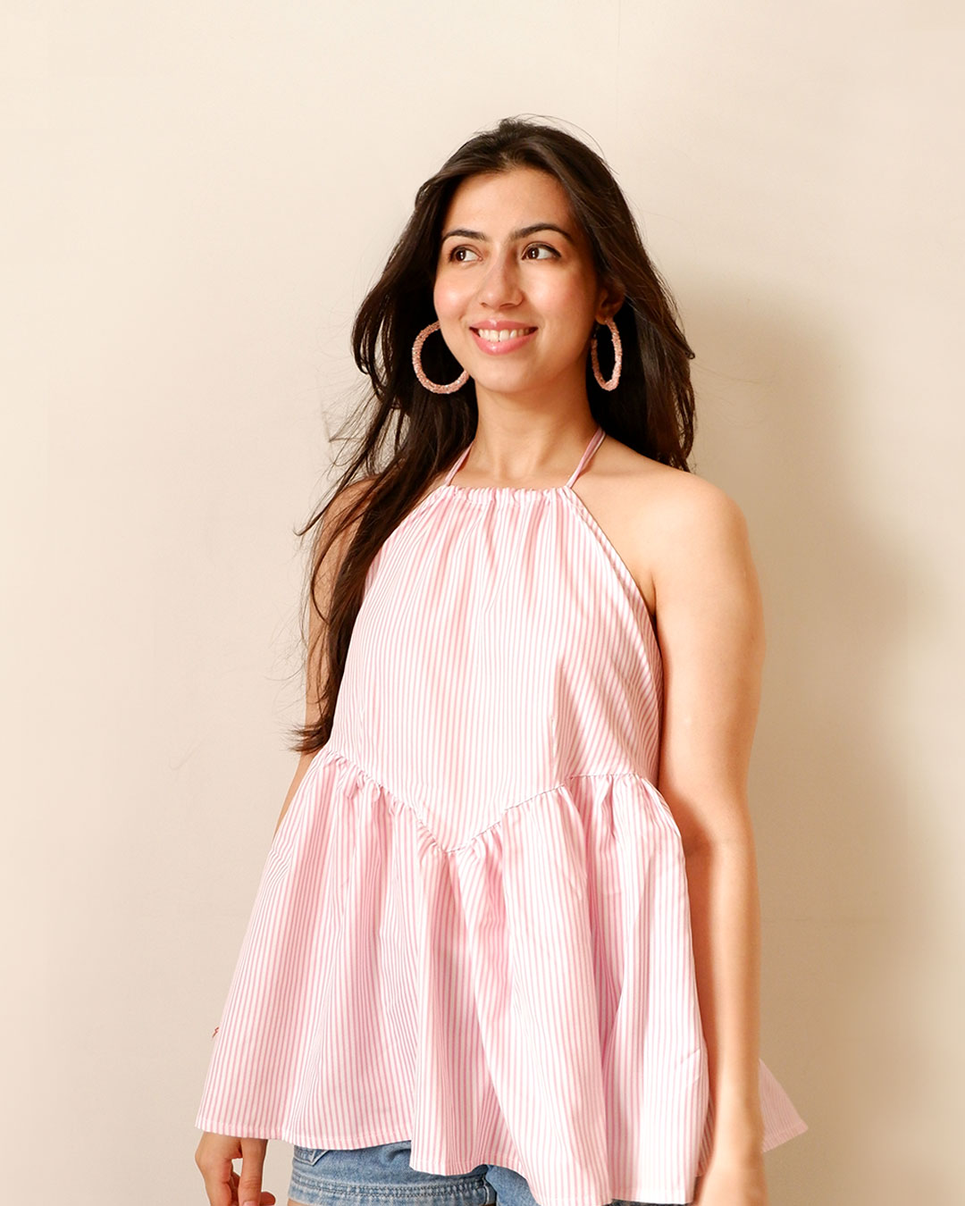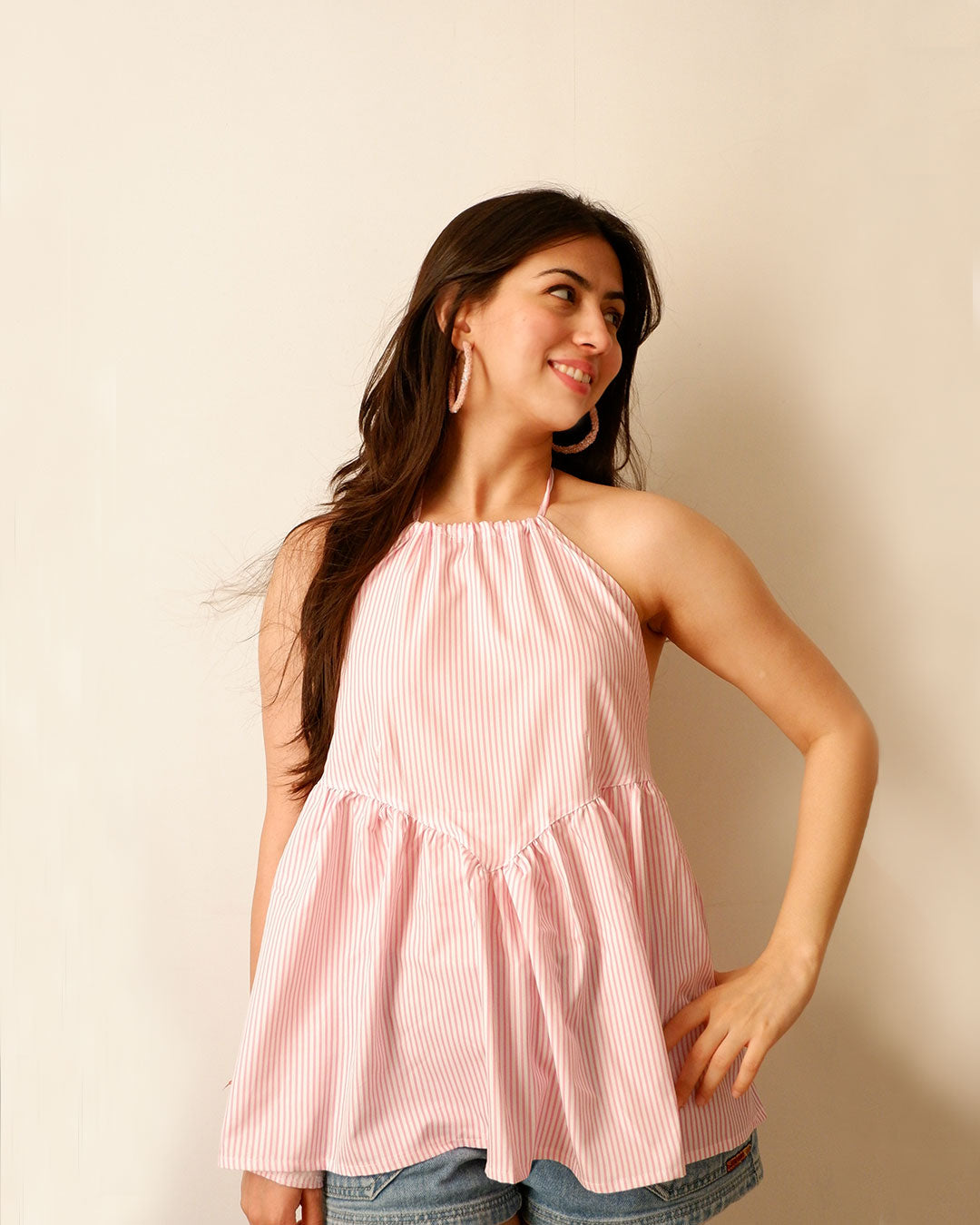 This striped halter neck top features a lace-up backless design, making it an ideal choice for vacation wear. Its stylish cut offers both comfort and a trendy look for warm-weather outings.
